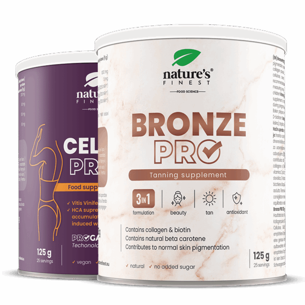 • Bronze PRO: Dodatek za porjavitev z edinstveno formulacijo 3v1 – Prispeva k normalni pigmentaciji kože in las, pomaga zaščititi celice pred oksidativnim stresom