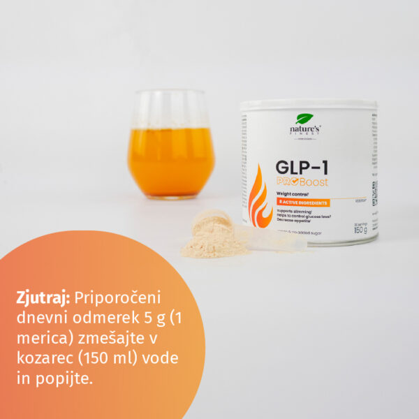 GLP-1 ProBoost: Priporočen dnevni odmerek je 5 g (1 merica). Zmešajte v kozarec (150 ml) vode in popijte. Za natančno odmerjanje priporočamo tehtanje.