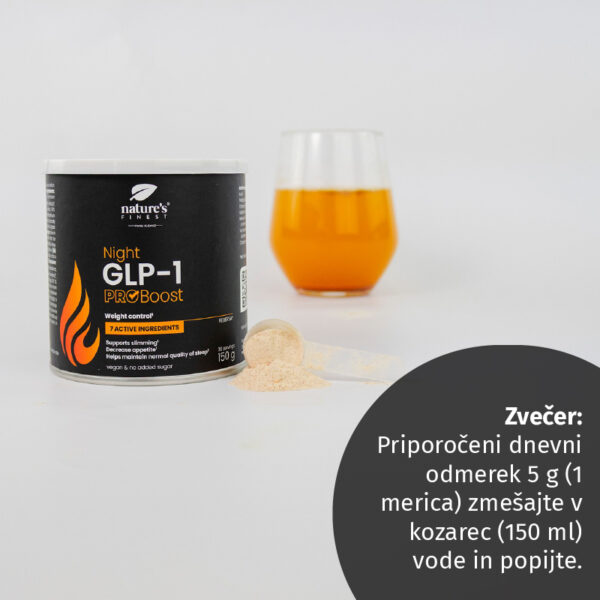 Night GLP-1 ProBoost: Priporočen dnevni odmerek je 5 g (1 merica). Zmešajte v kozarec (150 ml) vode in popijte. Za natančno odmerjanje priporočamo tehtanje.