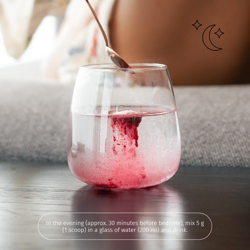 Ingredients: tapioca starch, sweetener erythritol, Morosil® (red orange (Citrus sinensis (L.) Osbeck)), orange flavor (3%), stabilizer: cellulose, L-carnitine, red wine extract (Vitis vinifera), extract of valerian (Valeriana officinalis L.), sweetener steviol glycoside.